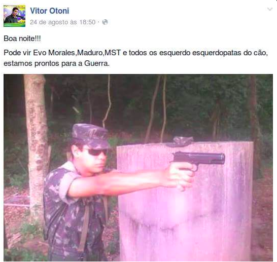 O presidente da juventude do PSDB do Espírito Santo, Vitor Otoni, achou normal vestir uma farda, pegar uma pistola, fazer uma foto da fantasia e postá-lo no Facebook. Na legenda: “Pode vir Evo Morales, Maduro, MST, e todos os esquerdopatas do cão, estamos prontos para a guerra”.